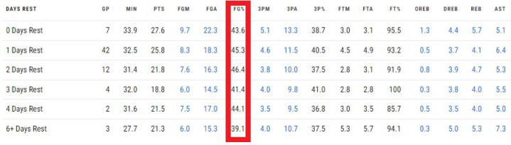 如上图所示,抛开休息至少6天以上“歇”大了的场景和背靠背的比赛。余下在休息1-4天的比赛之间,库里的进攻状态起伏不定。