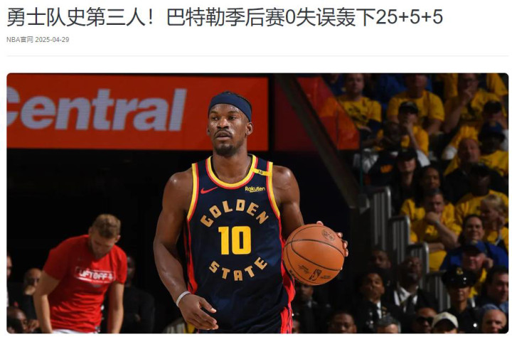 据NBA中国官网报道:单场25+5+5且0失误也让巴特勒成为杜兰特、伊戈达拉后勇士队史第三人。